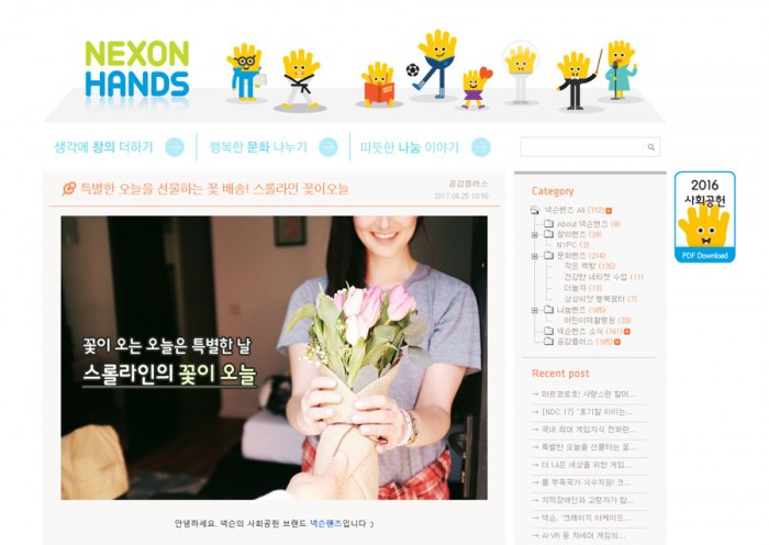 안녕하세요. 넥슨의 사회공헌 브랜드 넥슨핸즈입니다 :) 봄을 맞아 전국의 꽃이 만개하고 있는데요, 여러분도 꽃구경 많이 하셨나요? : ) 꽃을 보면 싱그러운 향기에 기분도 좋고, 행복한 일만 가