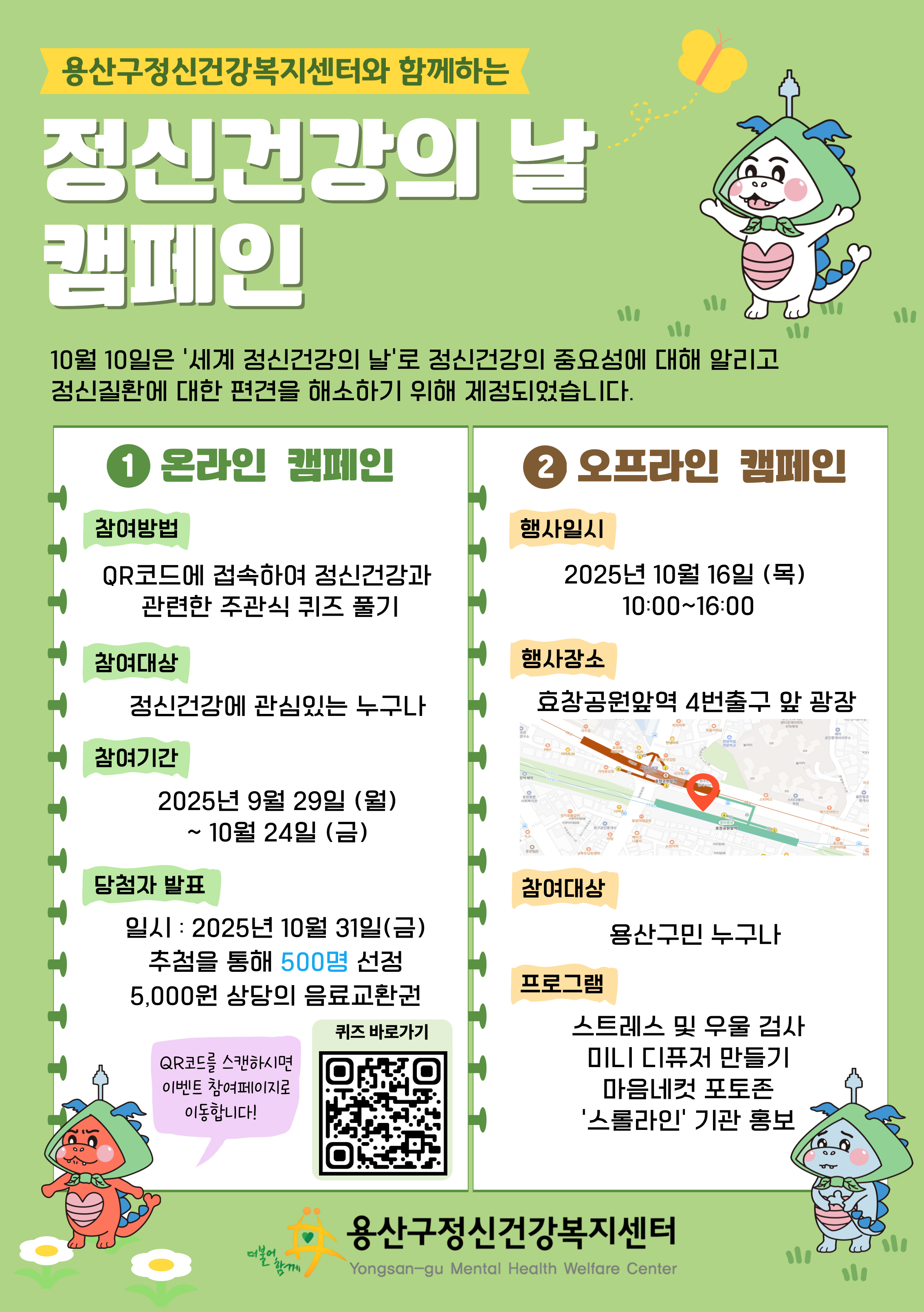 10월 16일(목), 효창공원앞역 광장에서 정신건강의 날을 맞아 용산구정신건강복지센터와 함께 홍보 부스를 운영하였습니다.