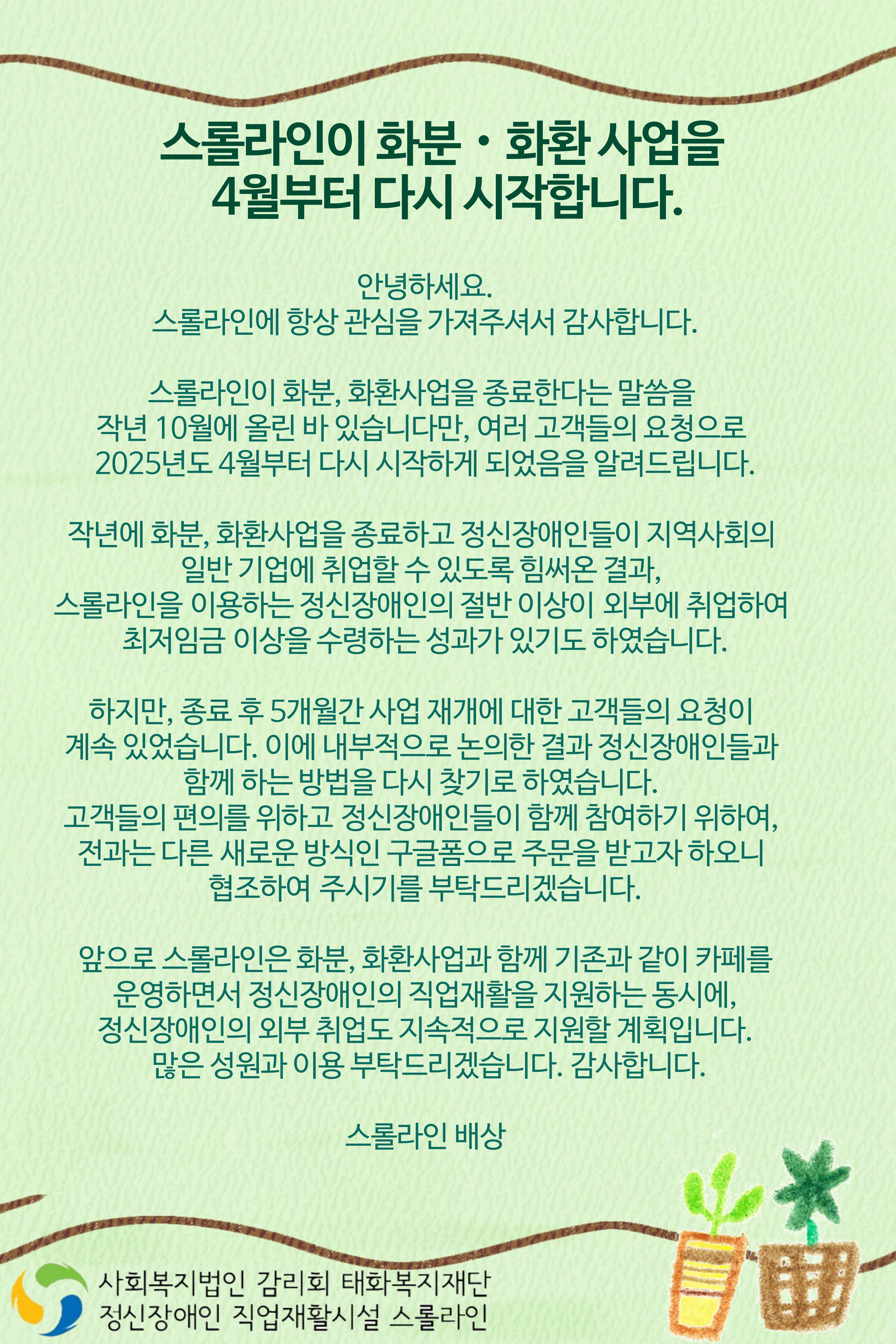 스롤라인이 오랫동안 여러분의 사랑으로 이어온 관엽 사업을 종료했던 저희가, 오는 4월부터 다시 시작하게 되었습니다.